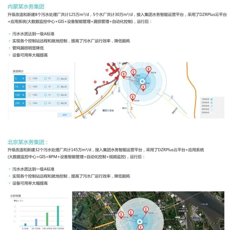 技术优势l 平台是经测试和验证的具有前瞻性的参考性架构,可支持水务行业端到端的、开放可扩展的、互联互通的、安全可靠的系统性设计l 能够实现大规模的现场智能设备的本地接入和远程接入,并且即插即用l 基于企业数据中心架构的数据采集、存储、分析、可视化与洞察l 基于人工智能的架构可为企业建立自己的知识中心,为未来智能优化运营奠定基础l 用户可自我在线自助增减应用软件,按需使用云端应用l 支持混合云(公有云+本地私有云)部署l 用户可基于全球领先的DZRPlus云平台轻松自助开发本企业的大数据分析与可视化运营优势l 运营平台的业务架构是基于“平台+端”的理念,平台本身聚集公司所有的资源并以软件化和数据化的方式提供给各子公司或各业务线等业务单元,各业务单元可按需获取平台资源,这将改变传统的运营管理模式,便于公司管理,放而不乱,各自便于核算,调动各业务单元的工作主动性与积极性。l 基于设备智能管理系统,提高减少设备故障和可使用性,可提高设备使用率15-30%,维修费用降低10-20%,延长设备生命周期20%以上l 基于能源智能管理系统,可节能10-15%l 基于管网智能优化调度系统,提高水质、控制压力、减少爆管,从而提高15-30%的调度效率,节约10-15%的电耗l 基于管网漏损管理系统,提高漏损管理效率20-30%,提高检漏效率50-70%,减少漏损2-5%,提高用水满意度20-30%,延长管网生命周期15%以上l 基于运营大数据的集中可视化云监控(云指挥调度监控中心),可提高企业综合管理决策效率20-50%服务优势l 基于享控云网上的成千上万工业品及全国各地的线下智能工业服务产业园的庞大的工业服务合作伙伴,我们将提供从方案咨询、集成实施、售后、运维、备品备件的4S级全生命周期服务,降低系统生命周期内总成本20%以上。l 可提供运营平台从投资、建设、运维/运营的多种合作方式,减少用户人才、财力投入压力